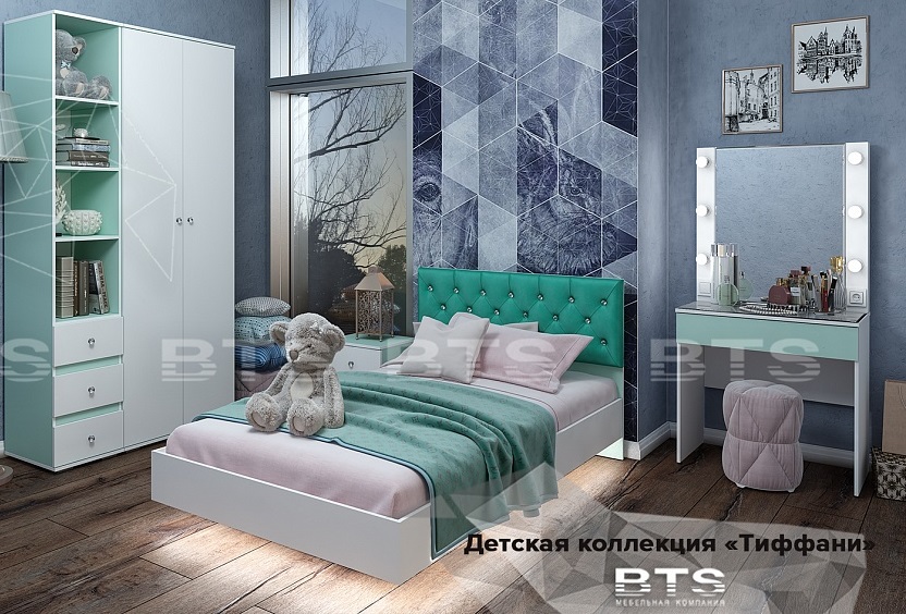 Модульная система для детской комнаты Тифани создана как для девочек раннего школьного возраста, так и для периода взросления. Нежно-бирюзовые тона корпусов коллекции в обрамлении снежно-белой кромки идеально гармонируют с белыми фасадами, украшенными ювелирными ручками.