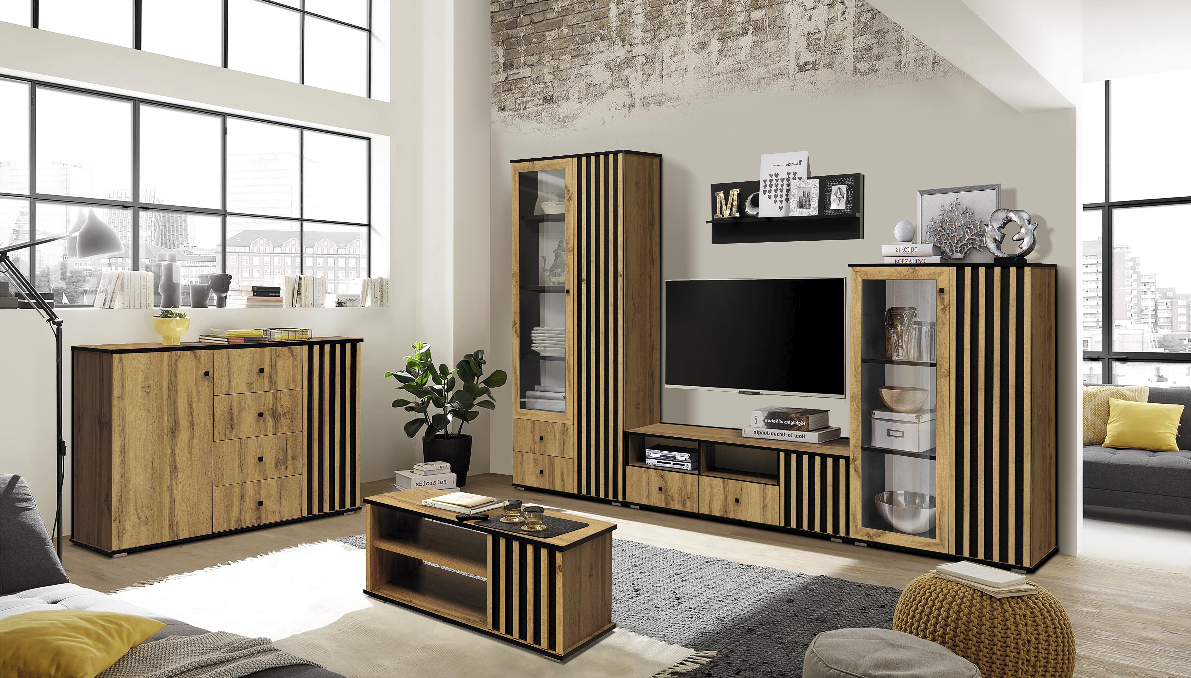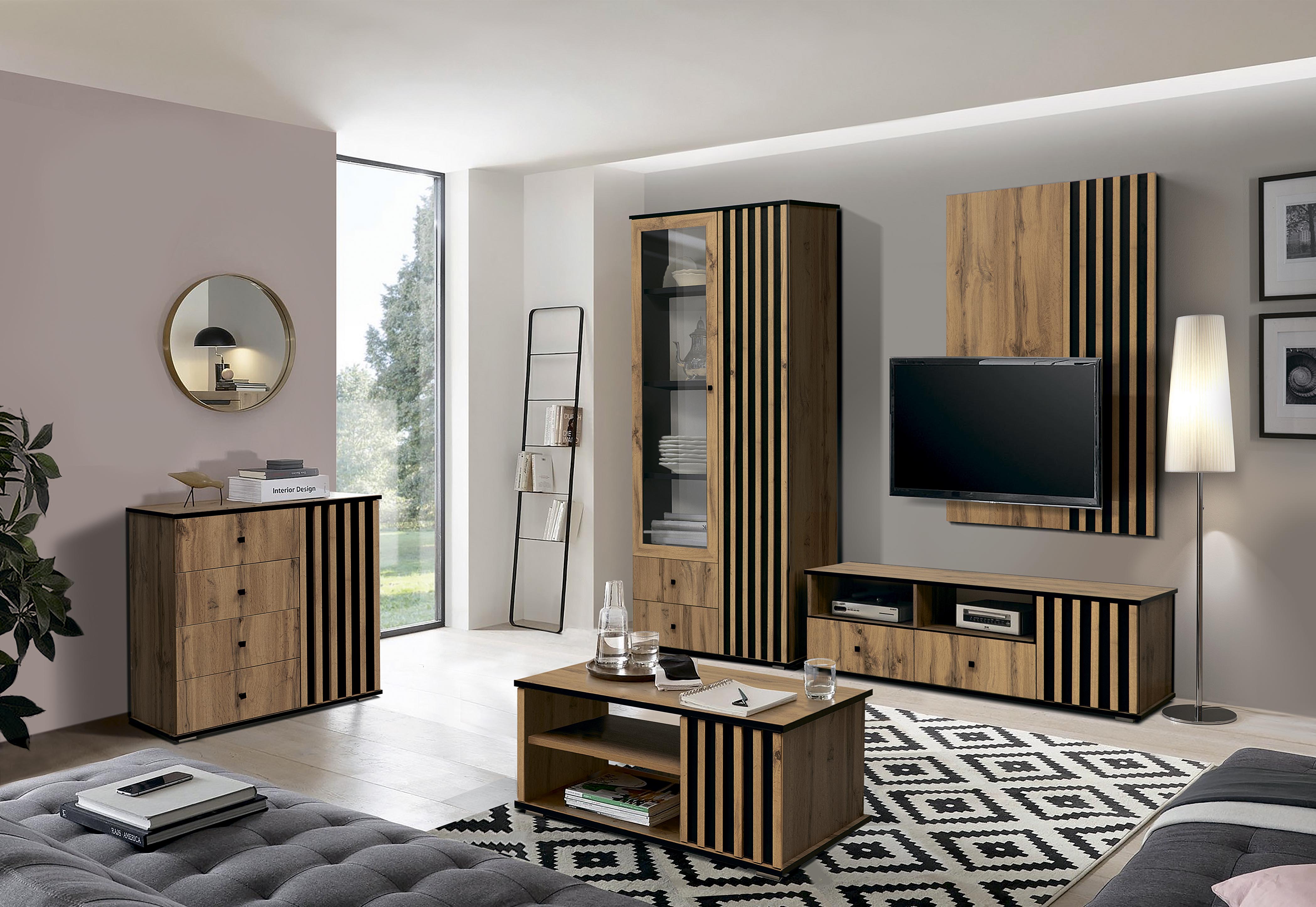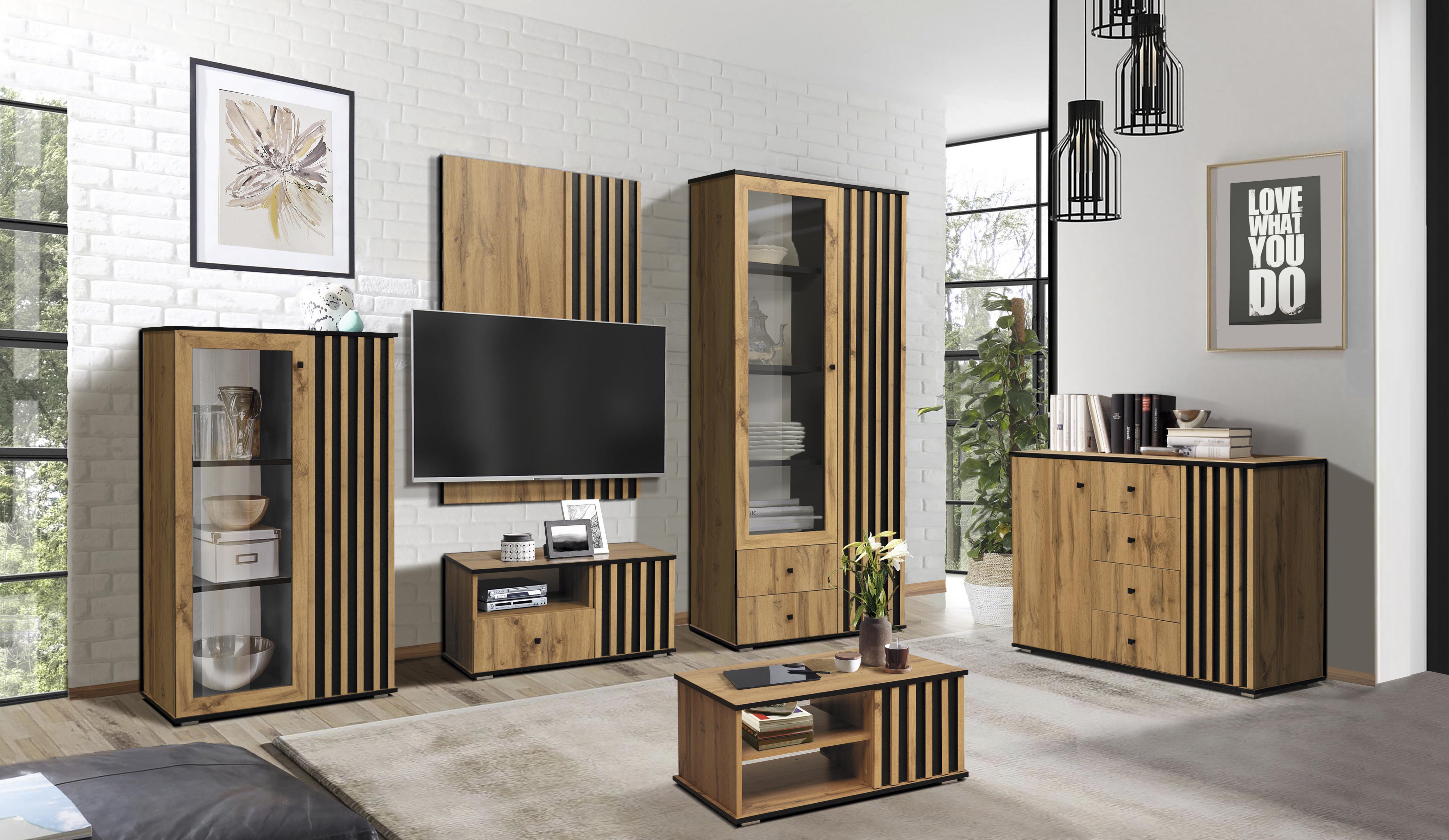 Древесный декор корпуса и фасадов неизменно ассоциируется с теплотой и домашним уютом, при этом чтобы обстановка получилась оригинальной, а не перегруженной, в дизайн модулей добавлен контраст с черными элементами. Черные металлические ручки и опоры позволяют получить красивую комбинацию, подчеркнуть текстуру, расставить акценты.