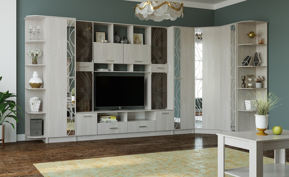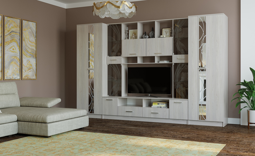Отличительная черта этой коллекции — модульный принцип и красивый пескоструйный орнамент зеркал, повторяющийся на всех элементах системы. Мебель изготавливается из ЛДСП.