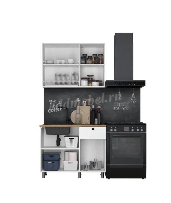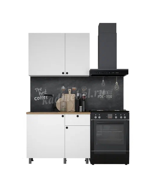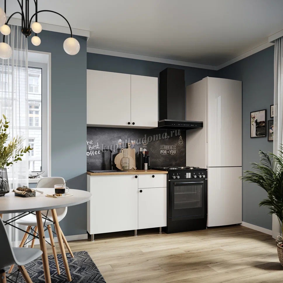 Функциональный готовый комплект кухни в едином корпусе с оптимальным набором модулей для небольших помещений. Лаконичные фасады ЛДСП белого цвета зрительно увеличивают помещение, черные ручки-кнопки с бархатистой поверхностью покрытия Soft-touch подчеркивают минимализм дизайна, пластиковые опоры серого цвета делают кухню легче и невесомей. Столешница в трендовом декоре «Дуб бунратти» с реалистичным крупным рисунком и оттенком древесной текстуры, входит в комплект в размере готового решения кухни.