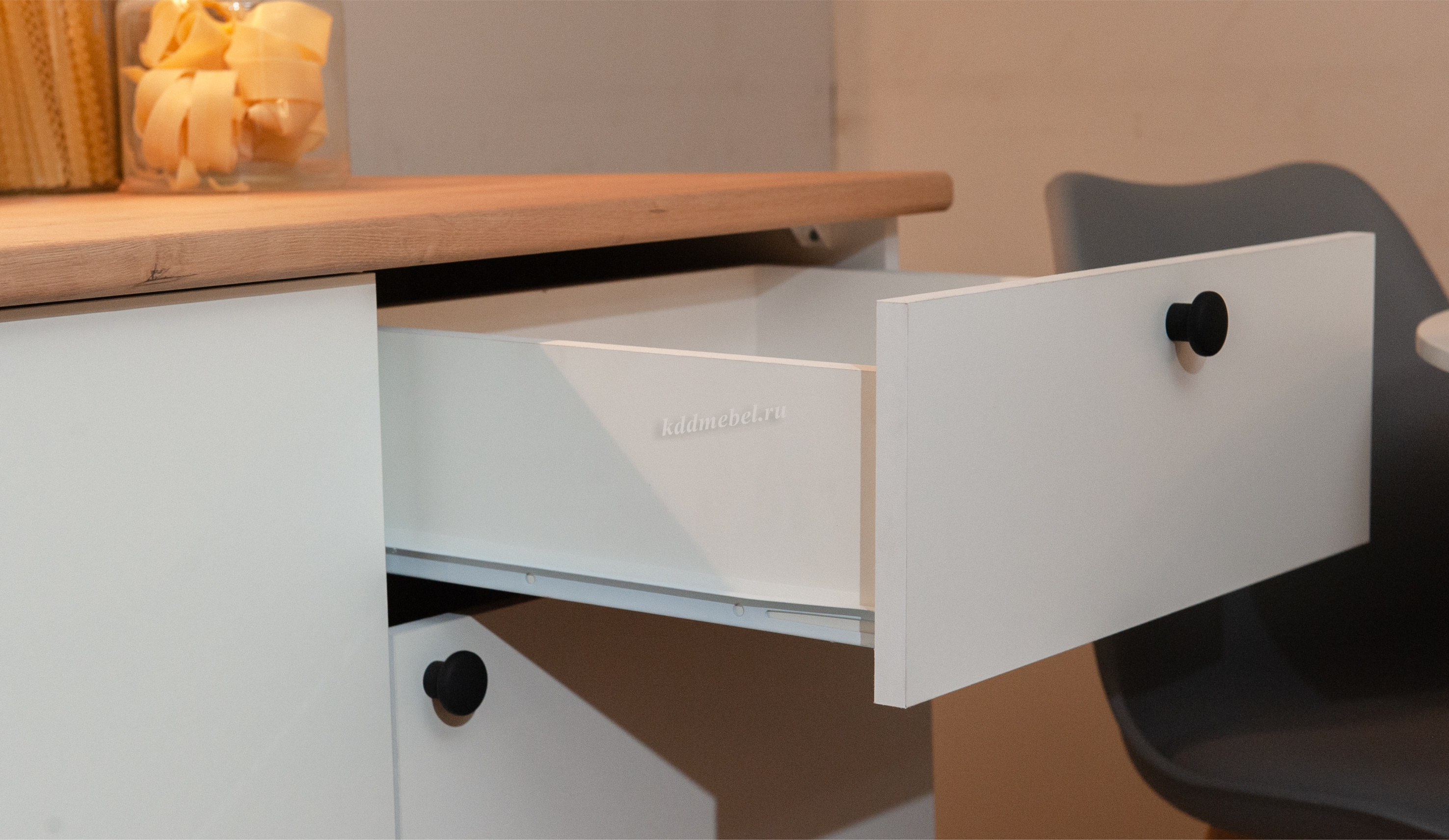 Фурнитура: Опоры пластик, Ручки пластик кнопки, покрытие Soft-touch, Роликовые направляющие, Петли Boyard