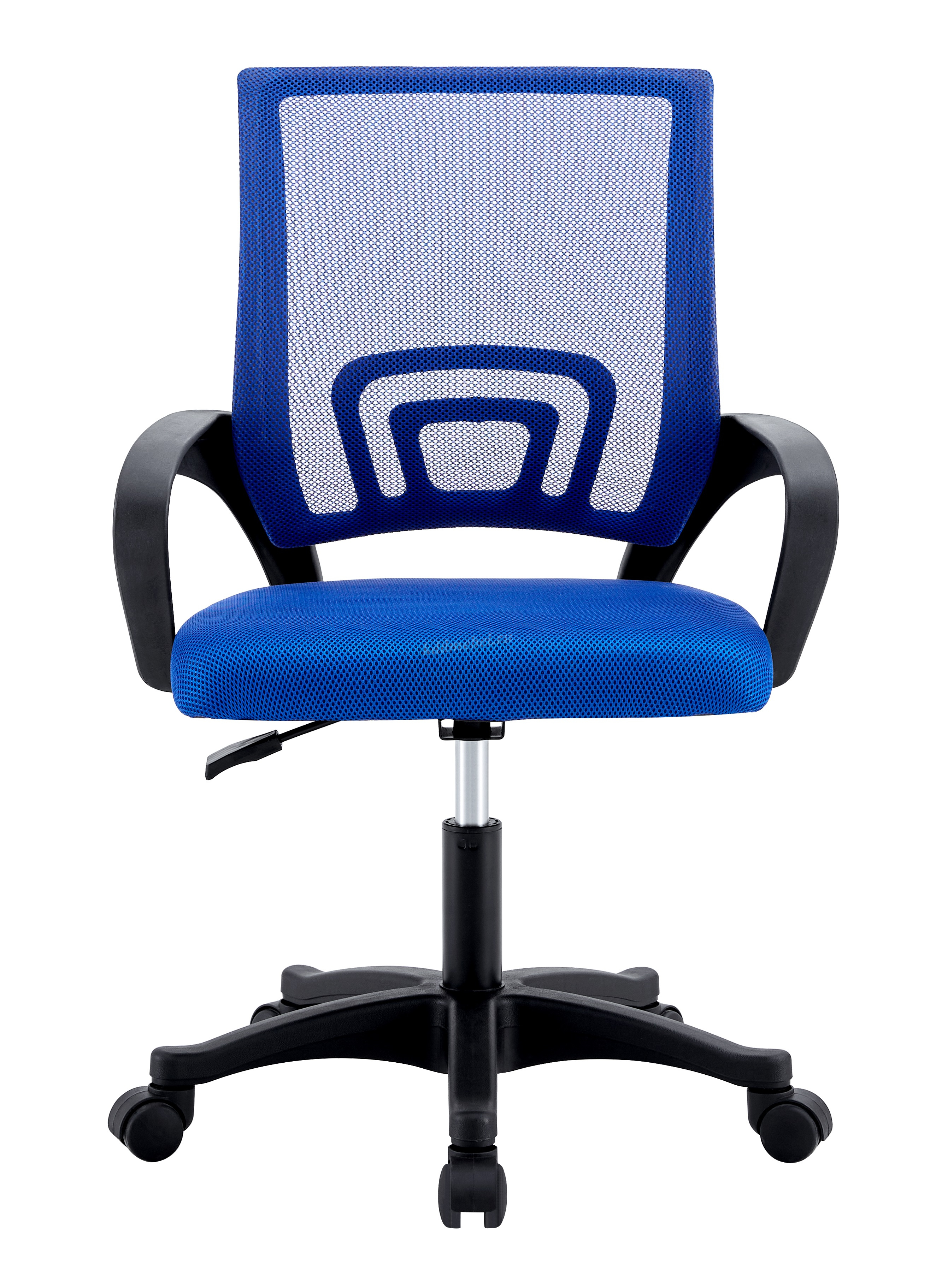 Современное офисное кресло с удобной спинкой, сиденьем из акриловой сетки и устойчивым пятилучным пластиковым основанием, снабжённым 50-мм двойными колёсиками.