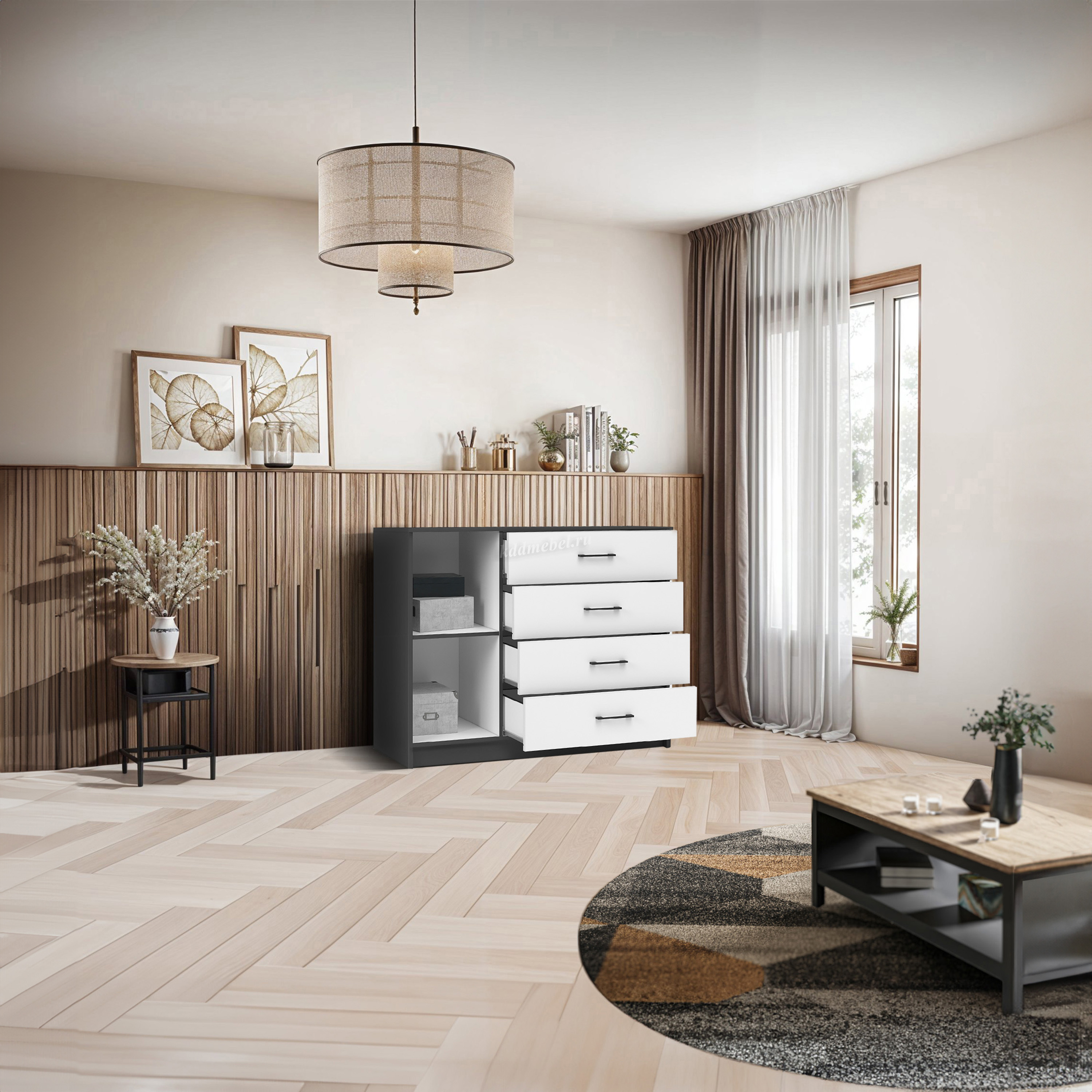 Практичный и надежный комод, изготовленный из прочного ЛДСП высокого качества, оборудован вместительными полками и выдвижными ящиками на роликовых направляющих для удобного хранения вещей по категориям. Нейтральные цвета декора визуально добавляют света и создают уют, а черные матовые ручки завершают композицию. Комод легко вписывается в готовые интерьеры благодаря своему универсальному дизайну и гармонично сочетается со всеми элементами модульной системы Чикаго