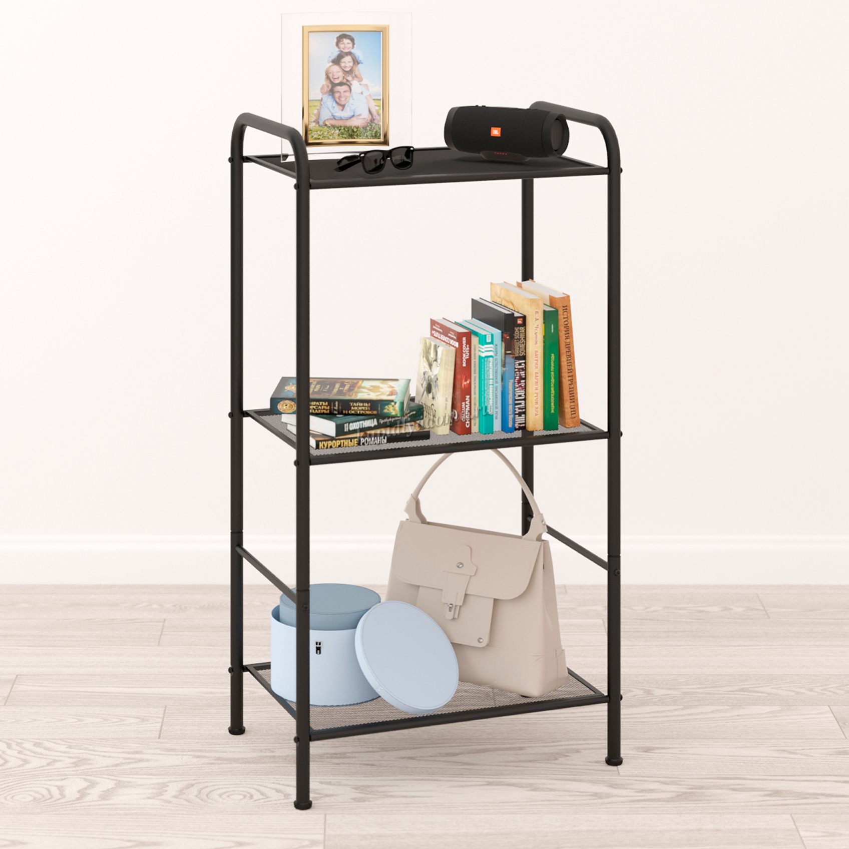 Система хранения имеет 3 металлических сетчатых полок, каждая из которых выдерживает нагрузку до 8 кг.
