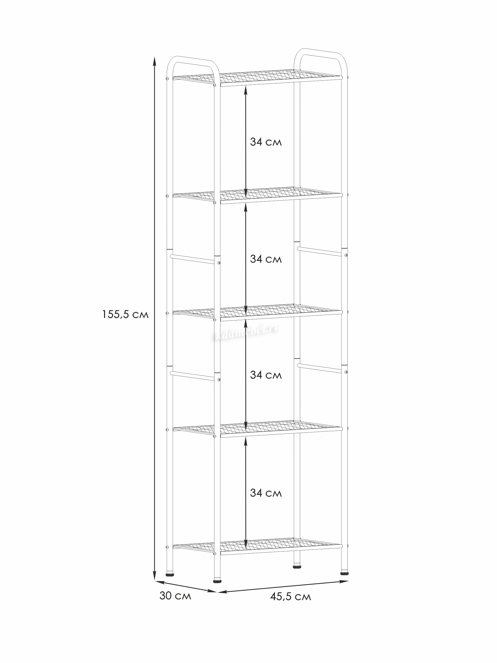 Система хранения имеет 3 металлических сетчатых полок, каждая из которых выдерживает нагрузку до 8 кг.